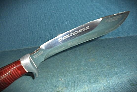 The knife is 11.25" overall with a red plastic grip, and it has its original sheath S/n 03295