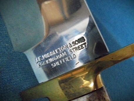 This is a medium-sized Bowie with an 8.5" clipped blade stamped J.E. MIDDLETON & SONS ROCKINGHAM STREET SHEFFIELD