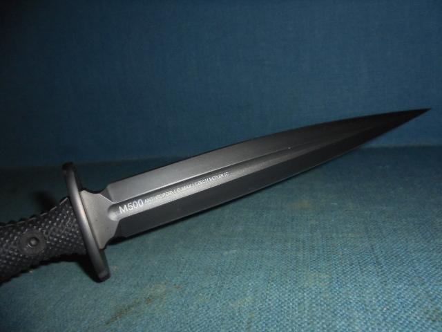 This is clearly based on the F/S fighting knife with a 7.75" double-edged blade etched M500 ANTHROPOID ELMAX CZECH REPUBLIC on one side and ACTA NON VERBA (Latin action not words) on the other