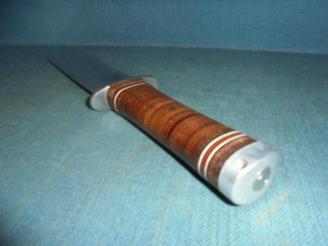 The knife is 15.25" overall with a stacked leather grip and comes with its original leather sheath S/n 03332