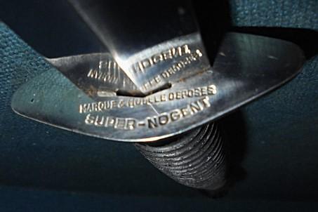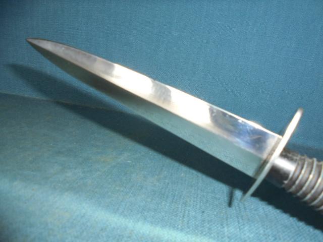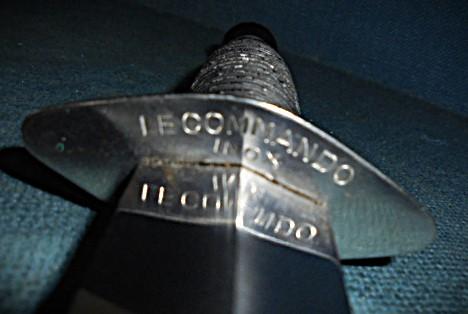 The grip is similar to a 3rd pattern, with the crossguard stamped LE COMMANDO INOX MARQUE & MODELE DISPOSE SUPER-NOGENT, and the knife has its original sheath (Leg tie broken) S/n 03334