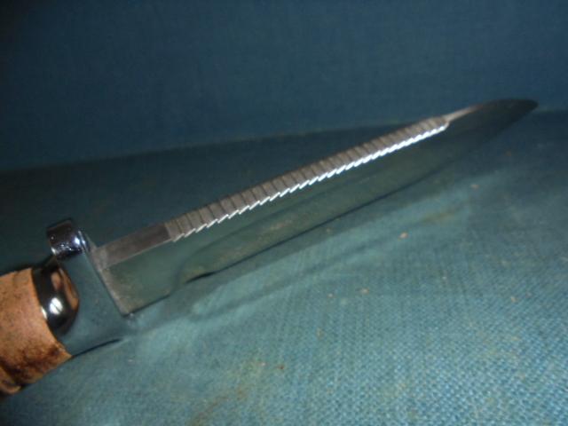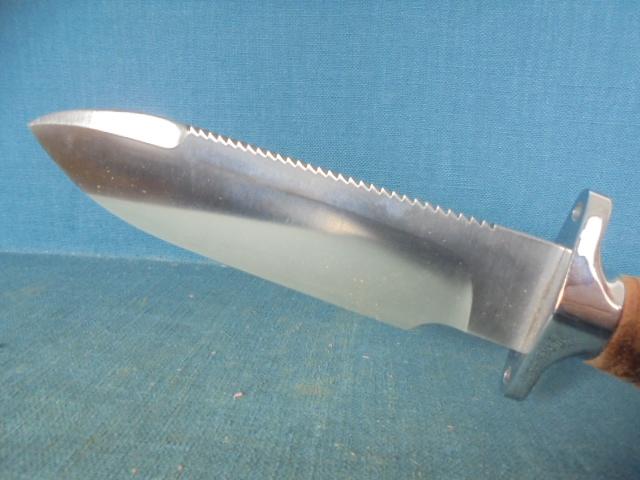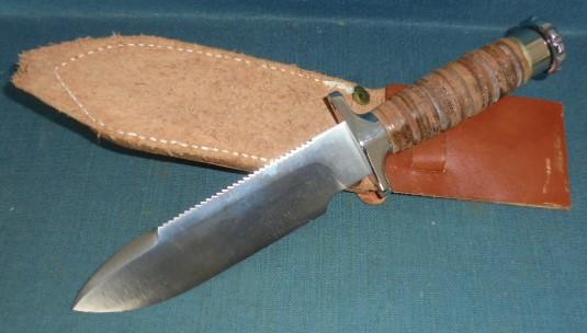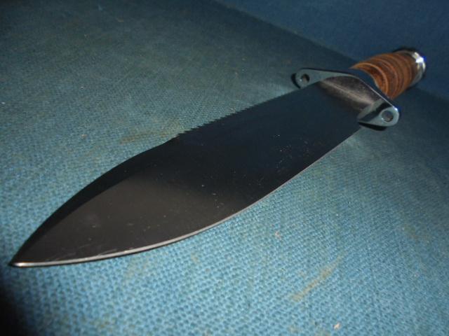 The knife is 11.95" overall with a stacked leather grip and a hollow handle, and the knife comes with its original sheath S/n 03336