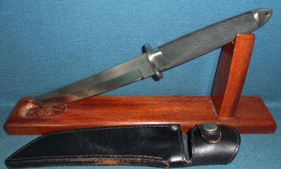 The knife is 13" overall with a steel guard pommel and a chequered rubber grip, and it has its original black sheath S/n 03365
