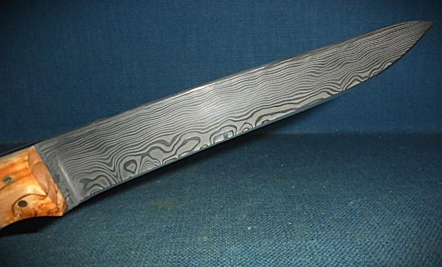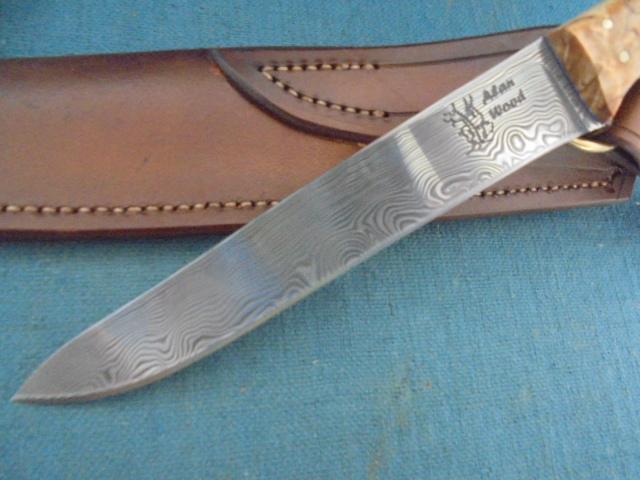 This knife is outstanding, with a 5.75" Damascus blade stamped with the logo Alan Wood, and it is 10.75" overall