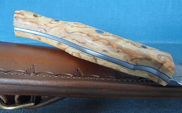 The knife has a tapered tang with blue liners and a birch grip, and it comes with its original sheath and booklet S/n 03366