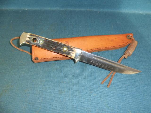 The knife is 9.5" overall with a stag horn grip, nickel-silver pommel, and a guard stamped 94374, and it comes with its original sheath, and a yellow/green box S/n 03370