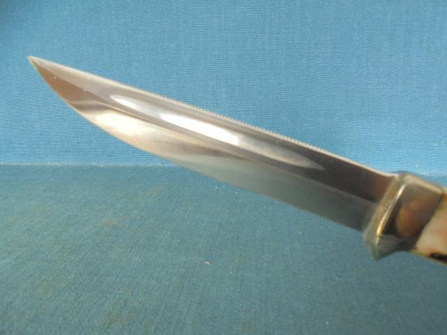 This is a rare knife with a 4.75" blade etched 6383 PUMA-BUDDY NEW STAINLESS SUPERKEEN CUTTING STEEL HANDMADE GERMANY with the cat's head logo plus a Rockwell stamp