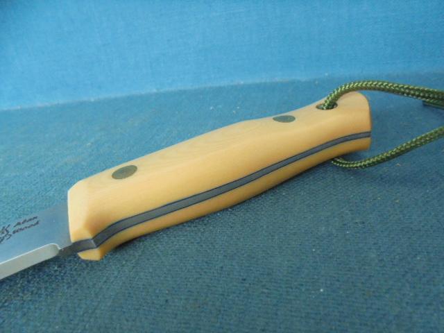 The knife is 9" overall with an off-white micarta grip with black liners, and the knife comes with its original custom-made sheath S/n 03371