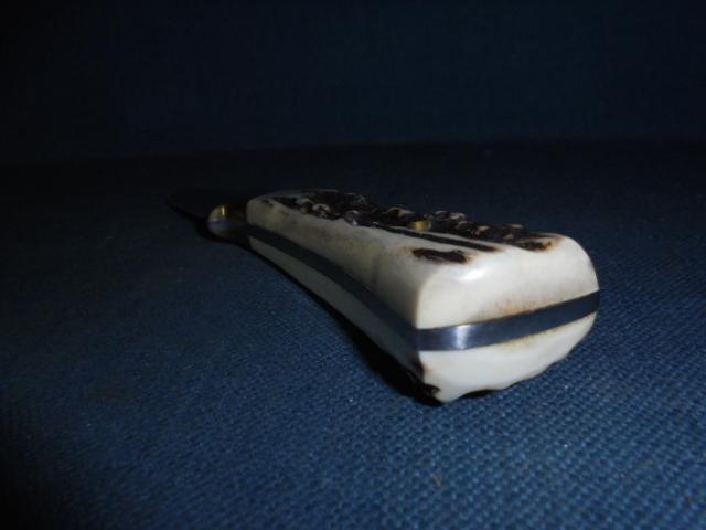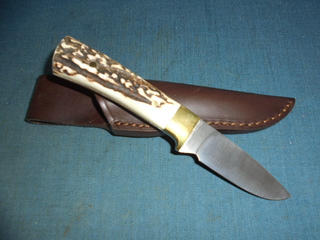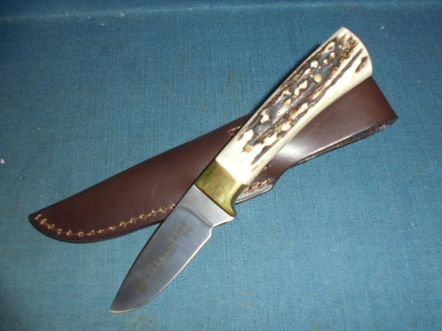 The knife is 8" overall with a brass bolster and a stag horn grip, and it has its original sheath and box S/n 03381