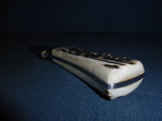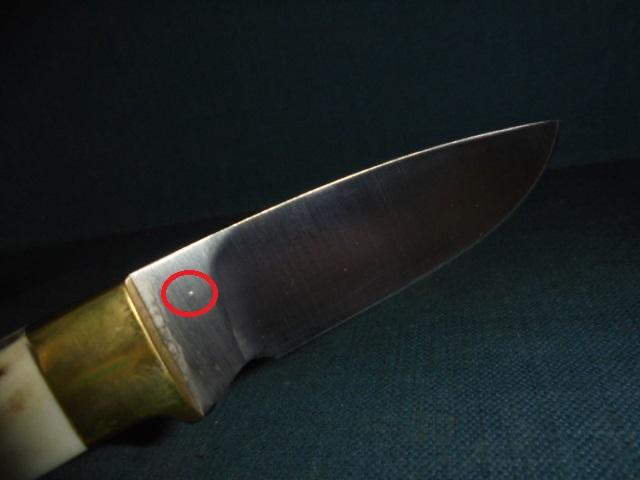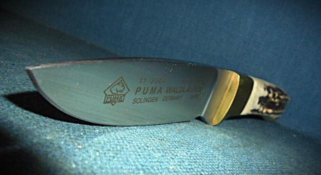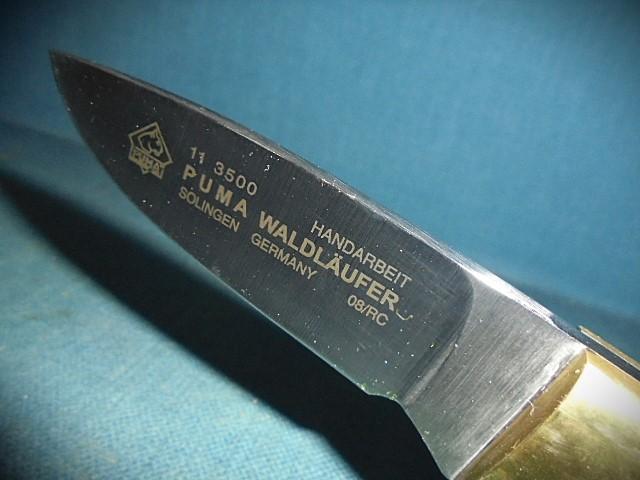 This is a great working knife with a 3.5" drop-point blade etched with the cat's head logo 11 3500 HANDARBIET PUMA WALDLAUFER (Forest Runner) SOLINGEN GERMANY 08/RC on one side and a Rockwell stamp on the other