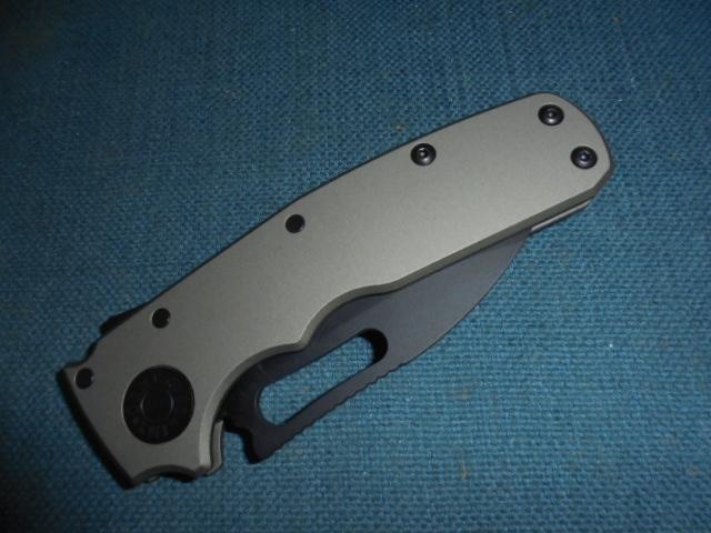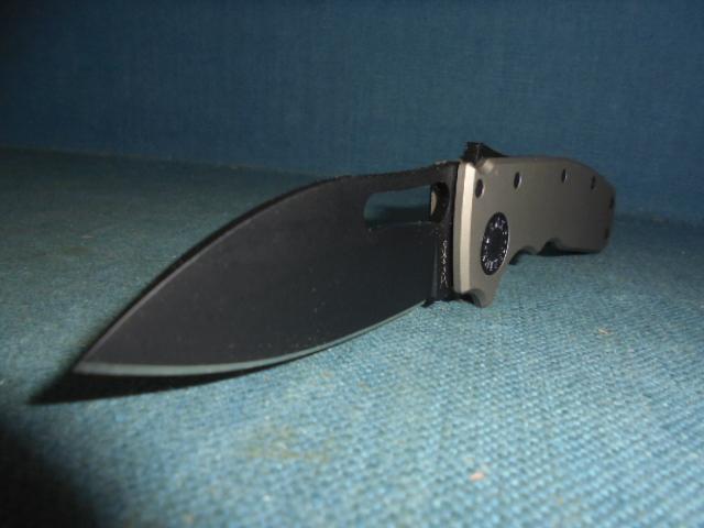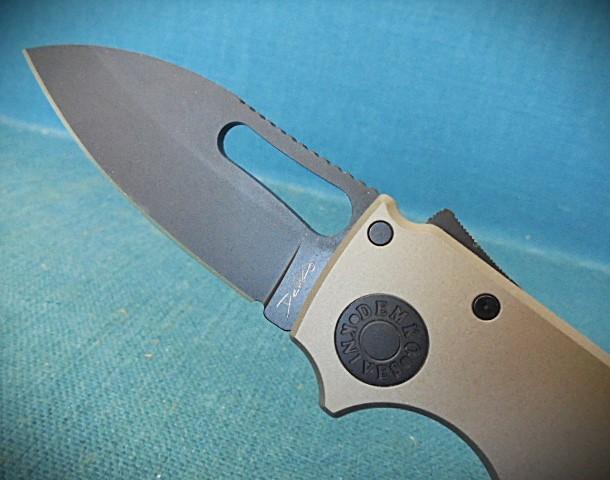 This is a quality knife with a 2.75" drop-point blackened blade, etched Demko on one side and CPM 20CV TAIWAN on the other