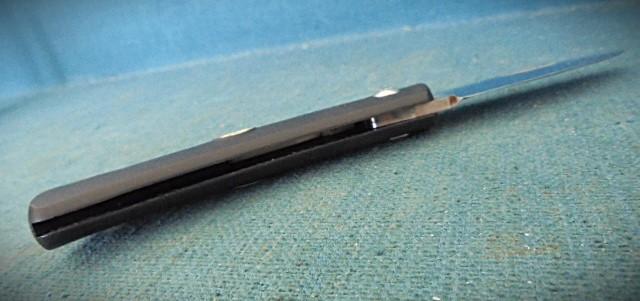 This knife has a 2.75" drop-point blade etched with three crowns TK4 3G steel, and stamped FALLKNIVEN on one side and stamped SWEDEN on the other
